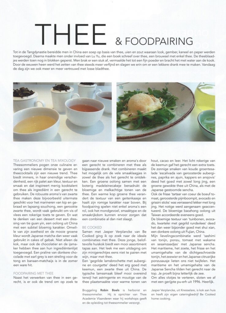 Samen met Jasper Verplancke van Be Cooked ging ik op zoek naar de ideale combinaties met thee. Deze jong belovende huiskok biedt een mooi assortiment tapas aan. Het leek me een uitdaging om zijn overheerlijke mini-gerechtjes eens niet te pairen met wijn maar met thee. De ‘gegrilde lamsbrochette met aubergine en courgette’ deed het erg goed met een Keemun, een zwarte thee uit China. De typische lamsmaak bleef mooi overeind terwijl het astringente en moutige van de thee plaats maakte voor warme tonen van hout, cacao en leer. Het licht rokerige van de Keemun gaf het gerecht een extra toets. De zonnige smaken van de koude groentensalade ‘escalivada van geroosterde aubergines, paprika en ajuin, kappers en ansjovis’ deed het goed met zowel Long Jing, een groene gewokte thee uit China, als met de Japanse gestoomde Sencha. De frisse ‘tartaar van coeur de boeuf tomaat, geroosterde pijmboompit, avocado & grissini sticks’ was verrassend lekker met Long Jing. Het notige werd aangenaam geaccentueerd. Maar ook de bloemige Baozhong oolong uit Taiwan accordeerde goed. De bloemige textuur van de ‘tuinbonen, avocado, kwartelei met gegrild rundsvlees’ deed het bijzonder goed met Shui Xian, een donkere oolong uit Fujian, China. Mijn lievelingscombi werd de ‘sashimi van tonijn, ponzu, tomaat met wakame en sesamzaadjes’. Het maritieme, het zoete, het frisse en het umamigehalte van de dichtgeschroeide tonijn, zeewier en het Japanse citrusrijke ponzusausje liet ons niet twijfelen. Het maritieme en het umamigehalte van de Japanse Sencha maakte van dit gerecht een topper. Je proeft letterlijk de zee ! Om dit alles vlotjes te verteren sloten we af met een gerijpte pu-erh uit 1996. Heerlijk !