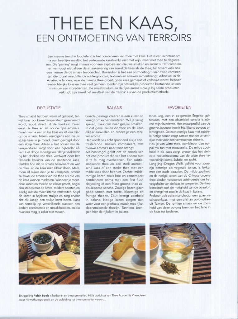 Een nieuwe trend in foodieland is het combineren van thee en kaas. Het is een avontuur om, na een heerlijke maaltijd, het vertrouwde kaasbordje, niet met wijn, maar met thee te degusteren. Deze ‘pairing’ zorgt immers voor een explosie aan nieuwe smaken en aroma’s. Het combineren verhoogt niet alleen de smaakervaring van zowel de kaas als de thee, het tovert vaak ook een nieuwe derde smaak tevoorschijn. Bovendien is het een ontmoeting tussen twee continenten, die totaal verschillende achtergronden, texturen en smaken samenbrengt. Alhoewel in de Aziatische landen, waar de meeste thee groeit, geen kaas gemaakt of verbruikt wordt, hebben ambachtelijke kaas en thee veel gemeen. Beiden zijn natuurlijke producten bestaande uit een minimum aan ingrediënten. De smaakrijkdom en de fijne aroma’s die je bij beide producten verkrijgt, zijn zowel het resultaat van de ‘terroir’ als van de productiemethode.