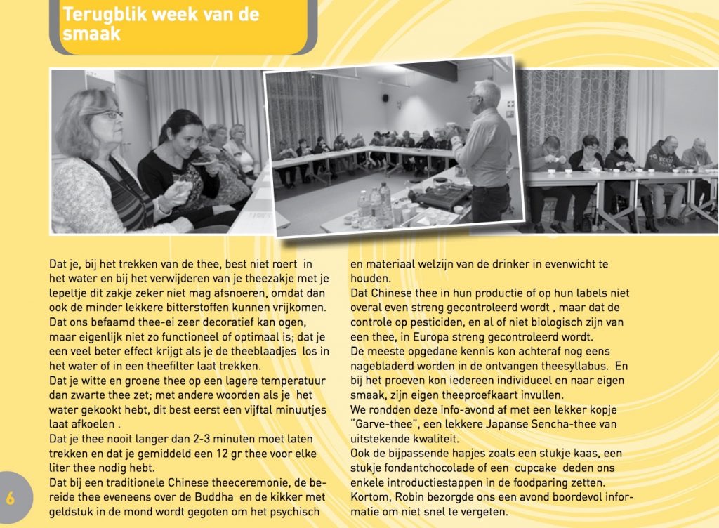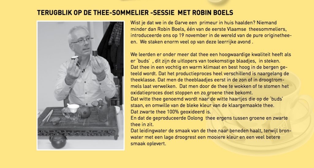 Wist je dat we in de Garve een primeur in huis haalden ? Niemand minder dan Robin Boels, één van de eerste Vlaamse theesommeliers, introduceerde ons op 19 november in de wereld van de pure originetheeën. We staken enorm veel op van deze leerrijke avond. We leerden er onder meer dat thee een hoogwaardige kwaliteit heeft als er ‘buds’, dit zijn de uitlopers van toekomstige blaadjes, in steken. Dat thee in een vochtig en warm klimaat en best hoog in de bergen geteeld wordt. Dat het productieproces heel verschillend is naargelang de theeklasse. Dat men de theeblaadjes eerst in de zon of in droogtrommels laat verwelken. Dat men door de thee te wokken of te stomen het oxidatieproces doet stoppen en zo groene thee bekomt. Dat witte thee genoemd wordt naar de witte haartjes die op de ‘buds’ staan, en omwille van de bleke kleur van de klaargemaakte thee. Dat zwarte thee 100% geoxideerd is. En dat de geproduceerde Oolong thee ergens tussen groene en zwarte thee in zit. Dat leidingwater de smaak van de thee naar beneden haalt, terwijl bronwater met een lage droogrest een mooiere kleur en een veel betere smaak oplevert. Dat je, bij het trekken van thee, best niet roert in het water en bij het verwijderen van het theezakje met je lepeltje dit zakje zeker niet mag afsnoeren, omdat dan ook de minder lekkere bitterstoffen kunnen vrijkomen. Dat ons befaamd thee-ei zeer decoratief kan ogen, maar eigenlijk niet zo functioneel of optimaal is. Dat je een veel beter effect krijgt als je de theeblaadjes los in het water of in een theefilter laat trekken. Dat je witte en groene thee op een lagere temperatuur dan zwarte thee zet; met andere woorden als je het water gekookt hebt, dit best eerst een vijftal minuutjes laat afkoelen. Dat je thee nooit langer dan 2-3 minuten moet laten trekken en dat je gemiddeld een 12 gr thee voor elke liter thee nodig hebt. Dat bij een traditionele Chinese theeceremonie, de bereide thee eveneens over de Buddha en de kikker met geldstuk in de mond wordt gegoten om het psychisch en materiaal welzijn van de drinker in evenwicht te houden. Dat Chinese thee in hun productie of op hun labels niet overal even streng gecontroleerd wordt , maar dat de controle op pesticiden, en al of niet biologisch zijn van een thee, in Europa streng gecontroleerd wordt. De meeste opgedane kennis kon achteraf nog eens nagebladerd worden in de ontvangen theesyllabus. En bij het proeven kon iedereen individueel en naar eigen smaak, zijn eigen theeproefkaart invullen. We rondden deze info-avond af met een lekker kopje “Garve-thee”, een lekkere Japanse sencha-thee van uitstekende kwaliteit. Ook de bijpassende hapjes zoals een stukje kaas, een stukje fondant chocolade of een cupcake deden ons enkele introductiestappen in de foodpairing zetten. Kortom, Robin bezorgde ons een avond boordevol informatie om niet snel te vergeten.